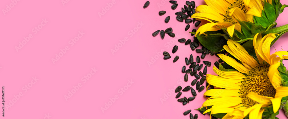 Beautiful fresh yellow sunflower and seeds on pink background Flat lay top view copy space. Sunflower natural background. Flower card. Harvest time, agriculture, farming. Healthy oils, food