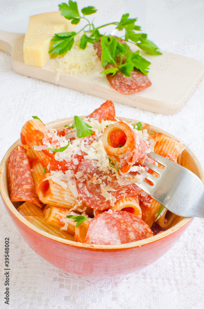 Rigatoni pasta with tomato sauce and pepperoni