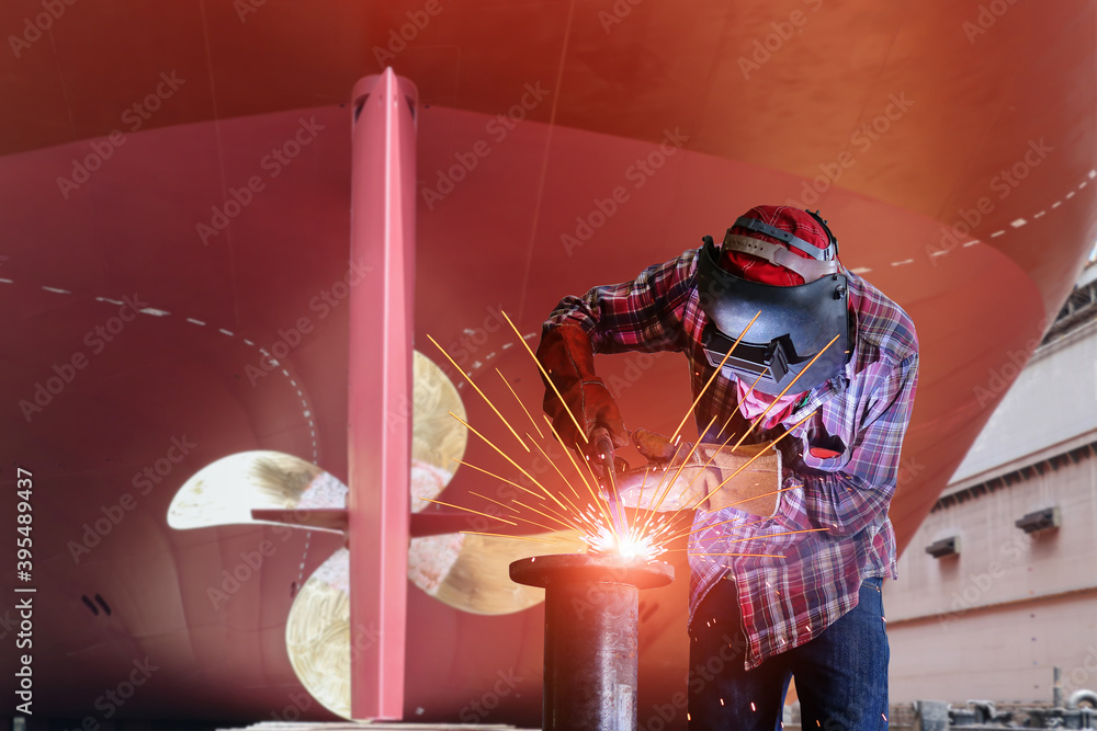 Welding is Welding ship repair in shipyard on Propeller on floating dry dock background with copy space.