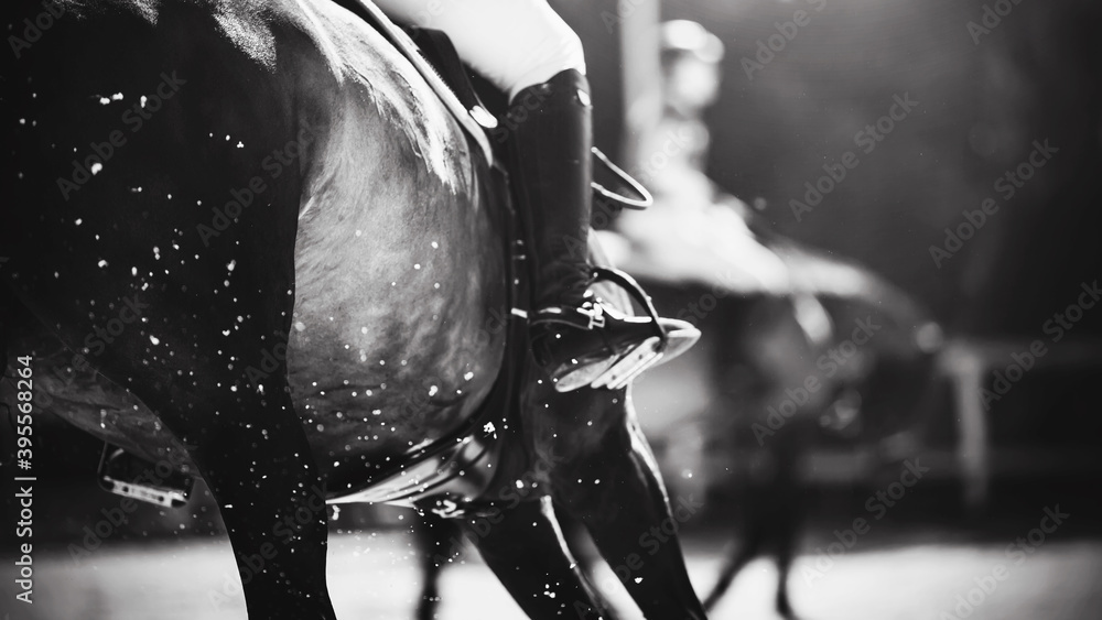 Black and white image of a fast horse with a rider in the saddle, which runs at a gallop and raises the hooves of the air dust and sand from the outdoor arena . Equestrian sport. Horseback riding.