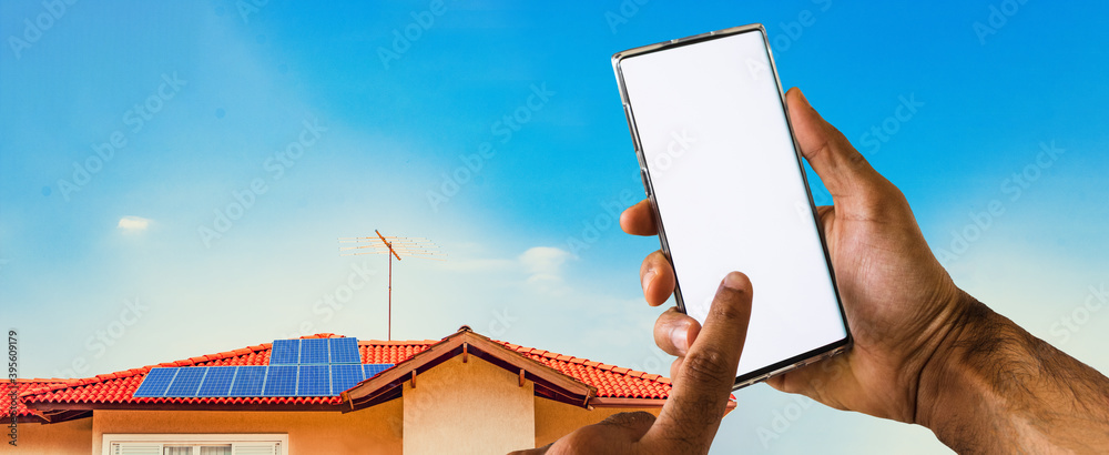 Male hands holding a mobile with solar energy photovoltaic panel at background. Space for text