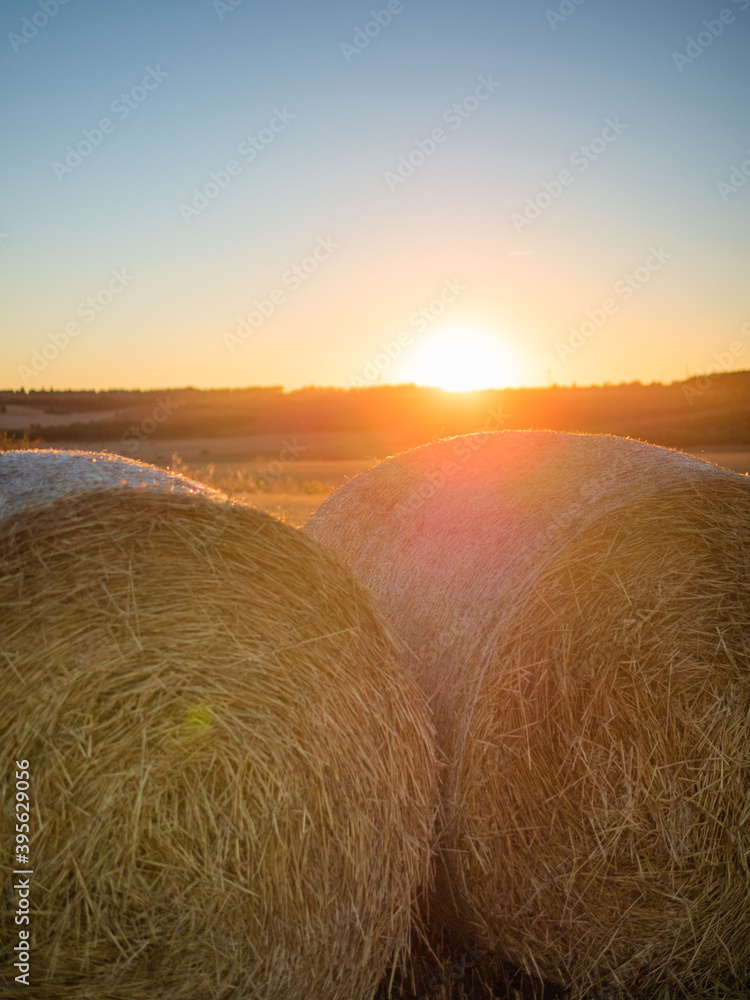 Photo at sunset with alpacas on mowed cereal field with mountains and large fields in the background