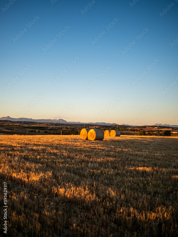 Photo at sunset with alpacas on mowed cereal field with mountains and large fields in the background
