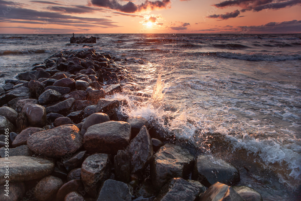 the Baltic Sea, with calm waves, and a beautiful sunset, a historical monument.