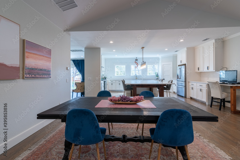 Open floor plan of dining room to kitchen, white, blue, modern, updated
