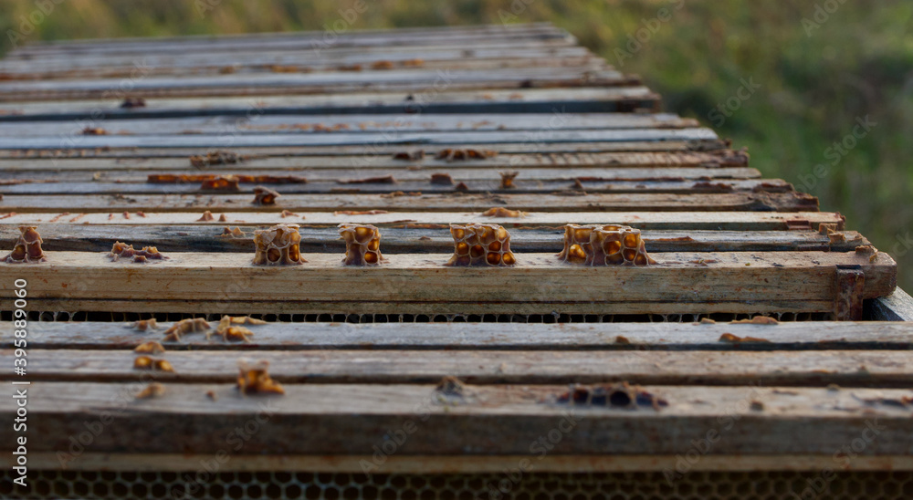 Beekeeping image showing wooden hive honeycomb inserts in rural setting