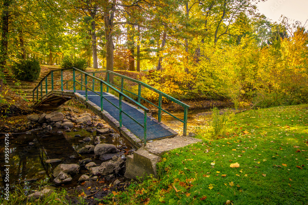 Autumn Fall Color Landscape. Small footbridge over a creek surrounded by vibrant fall foliage at a small county park in Jackson County, Michigan.