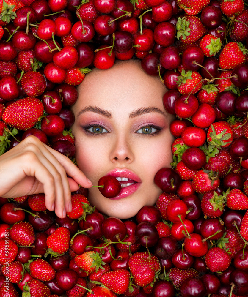 Attractive woman tasting cherry and strawberry. Beautiful woman with fashion makeup and a vivid background.