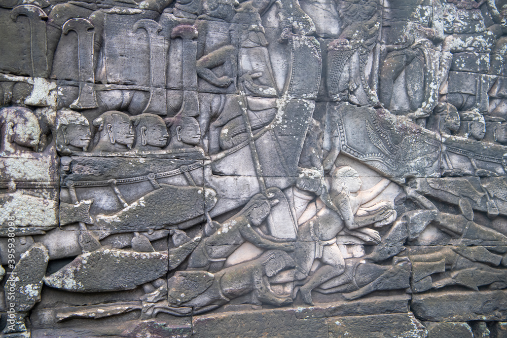 Bayon the central temple of Angkor Thom, late 12th century. Bas-relief. It rains in the rainy season. (Cambodia, 04.10. 2019)