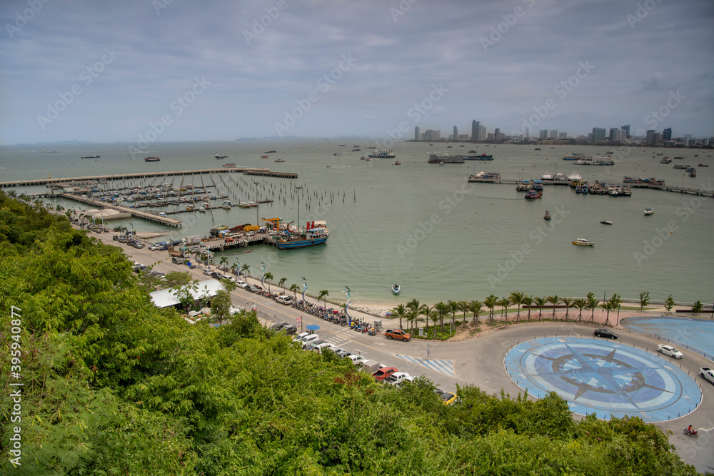 View of the Gulf of Siam and the city.Tourists walk along the promenade