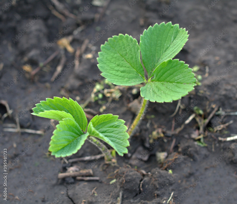 Photo of strawberry leaves, strawberries sprout from the ground in spring