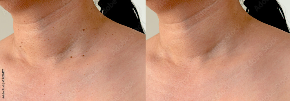Skin texture retouched, skin tags removal before and after treatment concept
