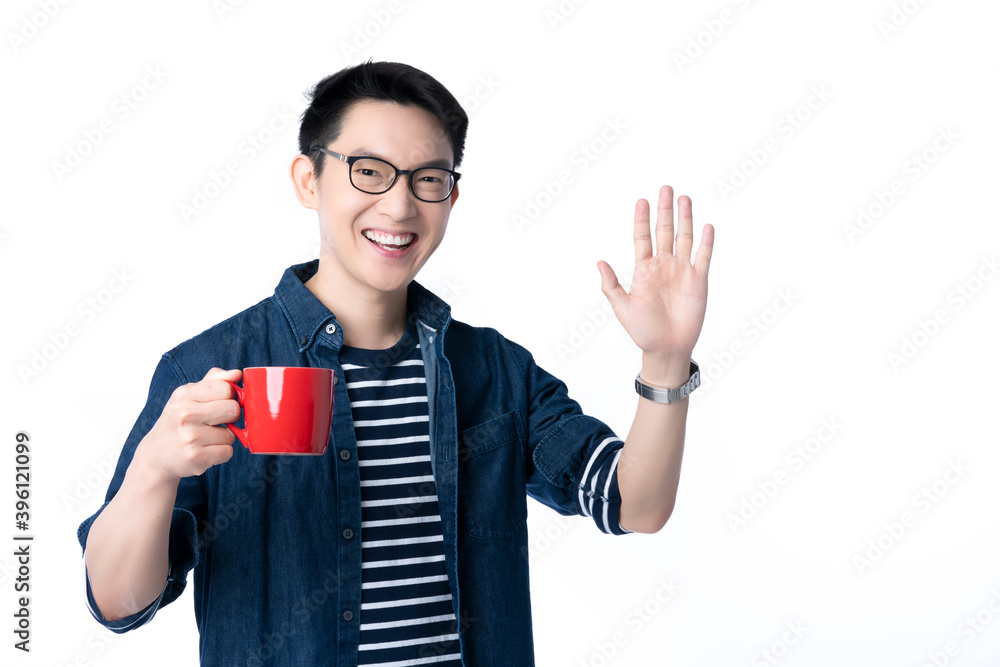 happiness casual asian mature adult male hand hold hot coffee drink with happiness cheerful and confident smile look at camera white background