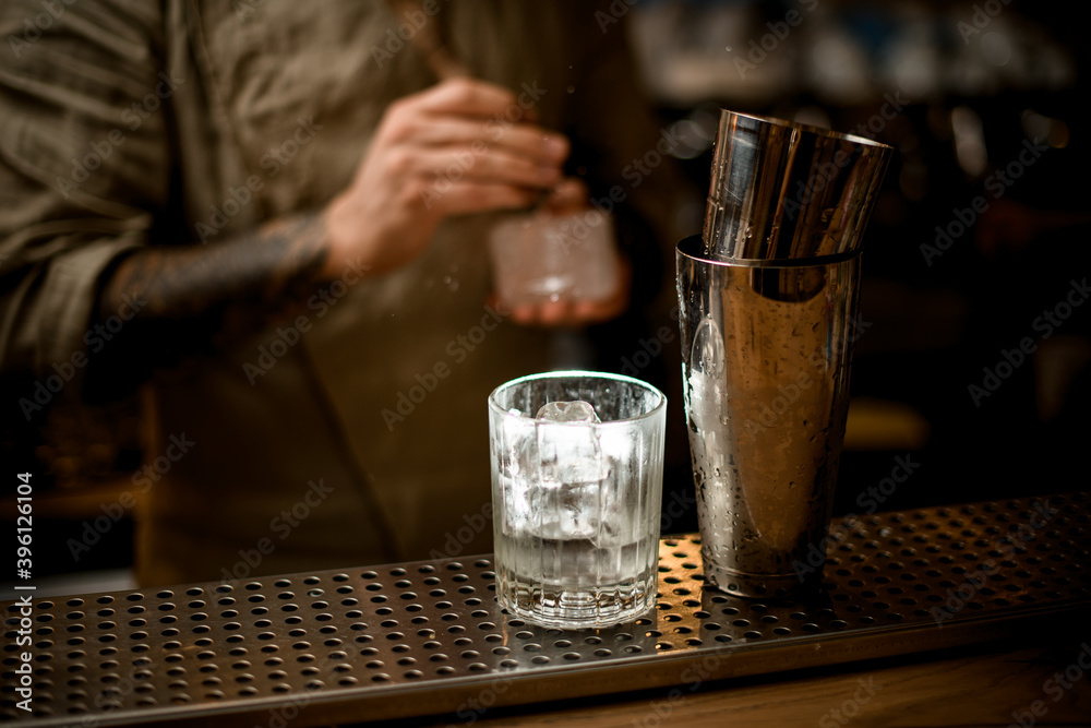 transparent old fashioned glass with ice and shaker stand on bar with bartender in background