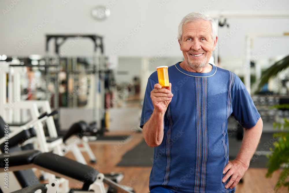 Senior man holding bottle of pills at gym. Portrait of elderly caucasian man showing pills. Best vitamins for men.