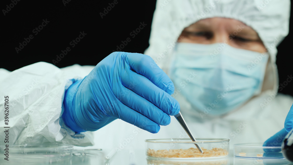 Scientist in the laboratory conducts experiments with maggots