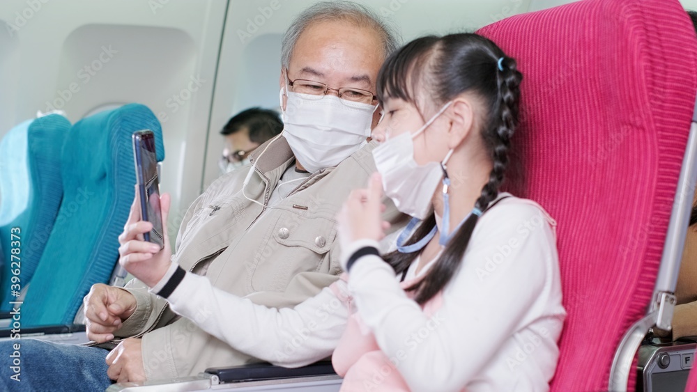 Asian grandfather is teaching to wear correctly the facial mask to his granddaughter.Coronavirus prevention on the airplane.travel concept