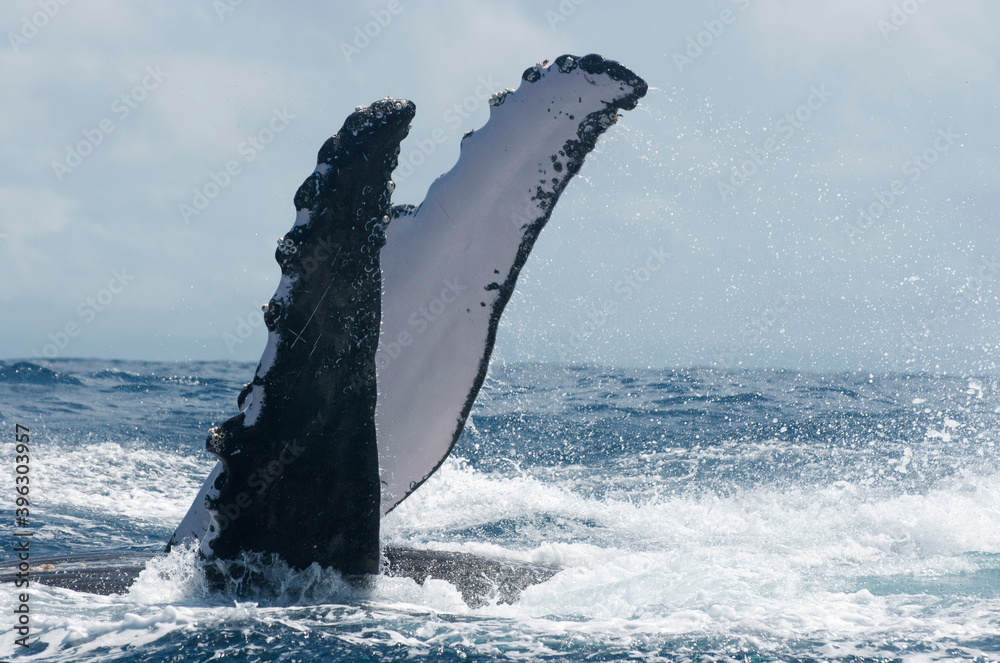 Breath-taking view of two pectorals of humpback whale swimming in a turbulent sea causing splashes, Indian Ocean Madagascar