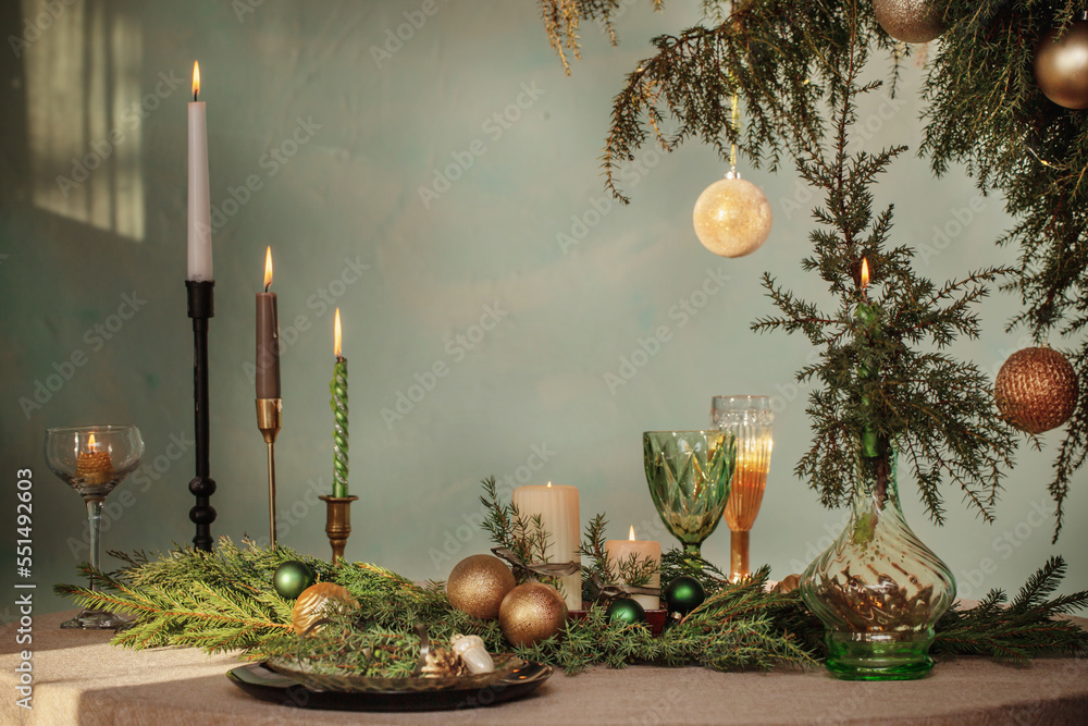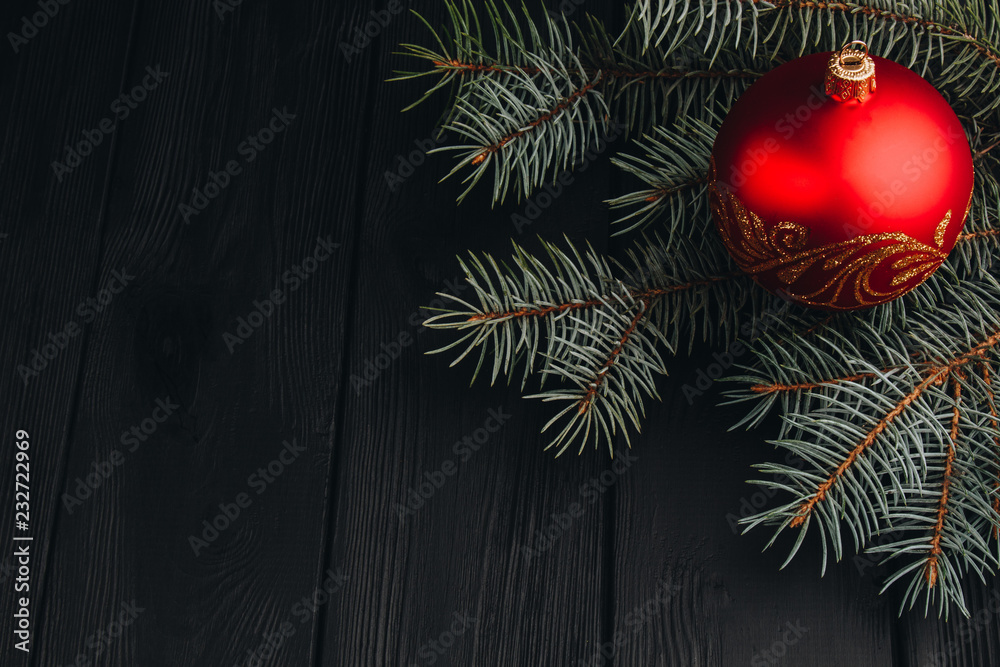 Open Christmas cracker with shiny confetti on red background, top view. Space for text