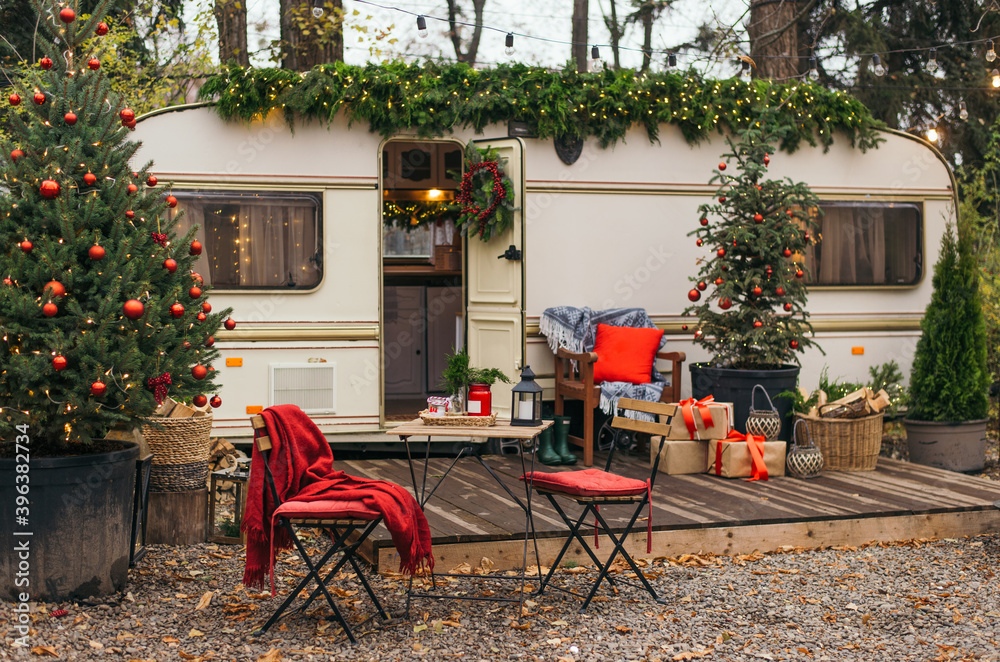 Caravan mobile home with terrace, Mobile home decorated with Christmas decor. Festive atmosphere - lights, red blankets, Christmas trees. Waiting for the snow. Caravan camping. mobile home trailer