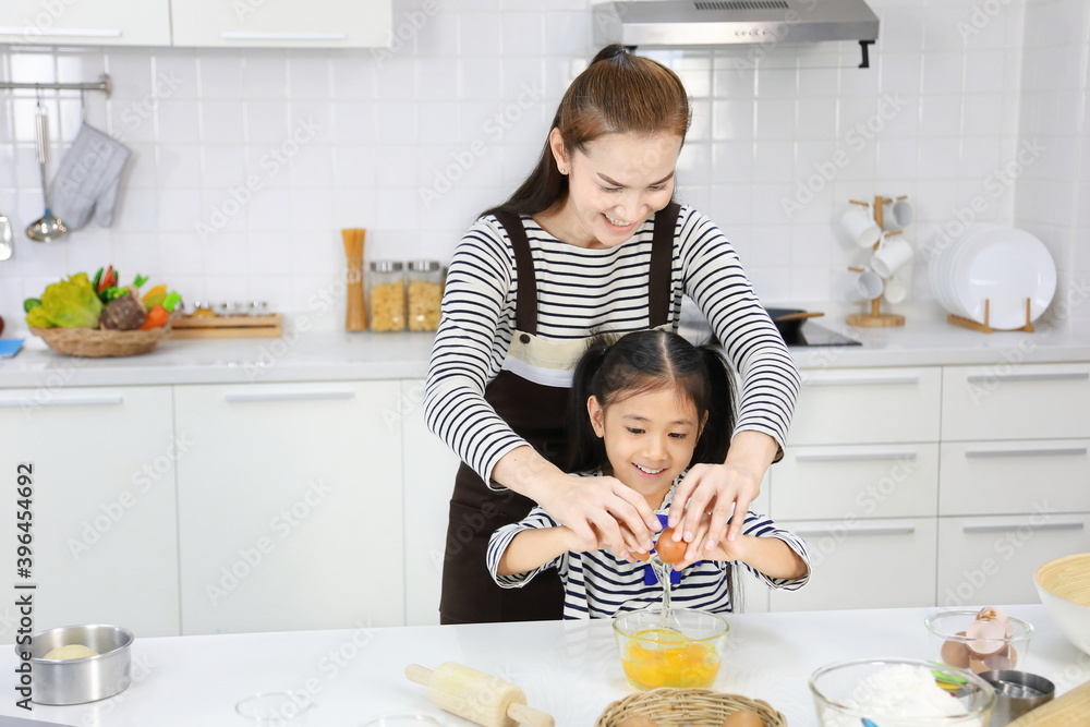 Happy Asian mother teaching her young daughter breaking egg for mixing with flour to bread baking in white modern kitchen