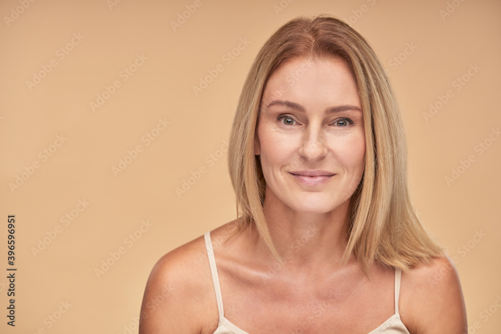 Natural beauty. Portrait of a charming middle aged caucasian woman with clean skin looking at camera while posing over beige background in studio