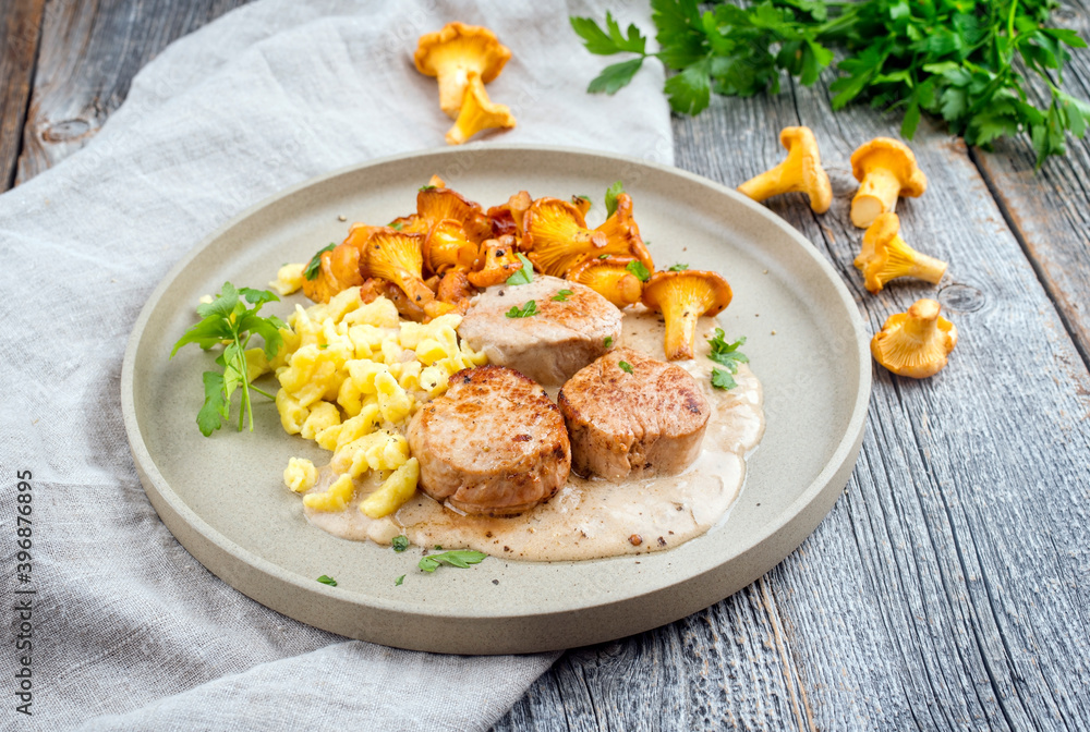 Modern Style traditionelle gebratene Filet Medaillons vom Schwein in Rahmsauce mit Pfipperlingen und Spaetzle serviert als close-up auf einem Nordic Design Teller