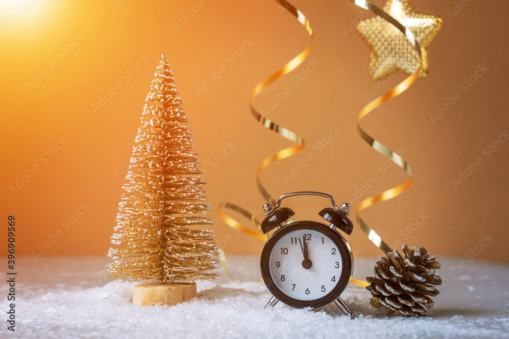 Alarm clock, Christmas tree toy and pine cone in golden light. Christmas decorations, New Year concept. Close up