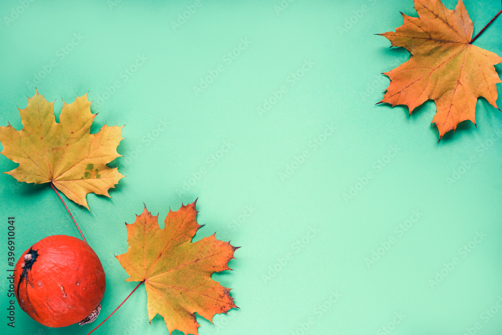 Autumn flat lay with maple leaves and orange pumpkin on green background. Top view, flat lay, copy space