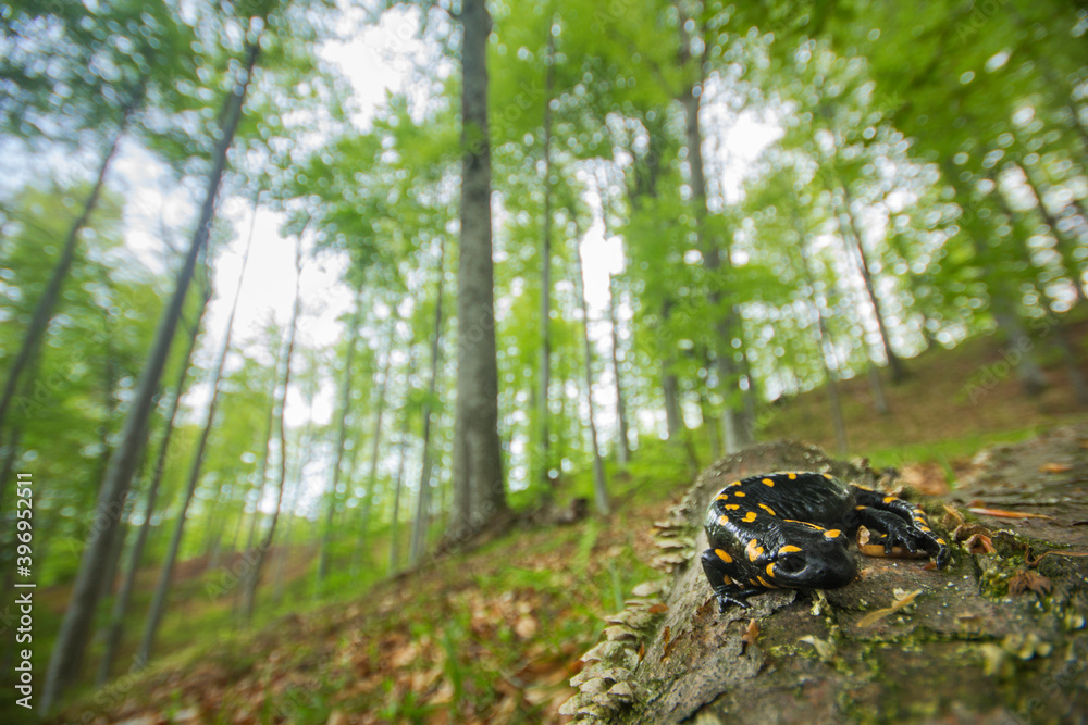 Fire salamander in its natural forest habitat, Transylvania, Romania