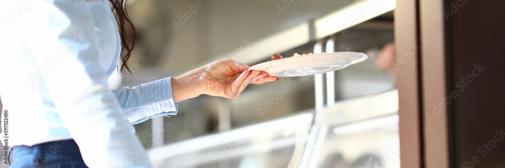 Woman stands with tray and holds dinner dish in her hands. Service and service in restaurant at concept hotels
