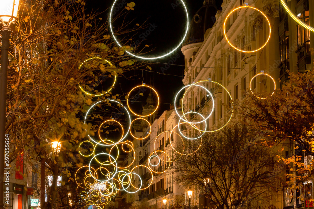 Iluminación navideña de la calle Mayor de Madrid, España. Noche en esta histórica calle con aros de luces doradas colgando en medio de la calle.