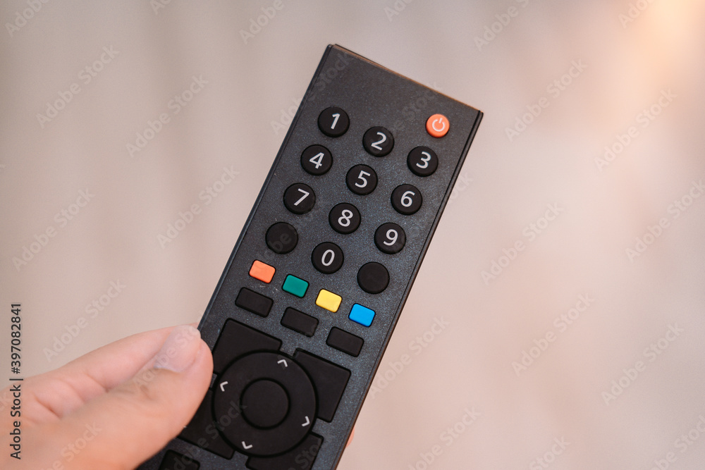Closeup point of view photography of female hand holding modern tv remote control and changing virtual channels.