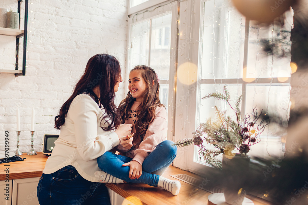Mother and daughter relaxing on kitchen window sill by decorated Christmas tree. Family having fun together at home