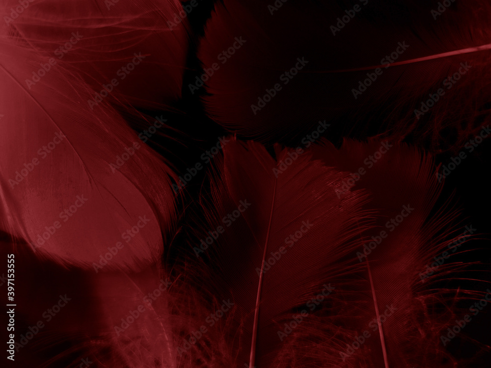 Beautiful abstract red feathers on dark background and soft white feather texture on red pattern and red background, pink feather wallpaper, love theme, wedding valentines day