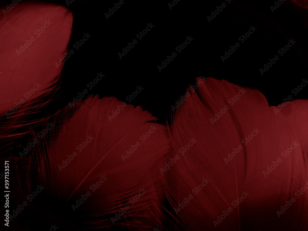 Beautiful abstract red feathers on dark background and soft white feather texture on red pattern and red background, pink feather wallpaper, love theme, wedding valentines day