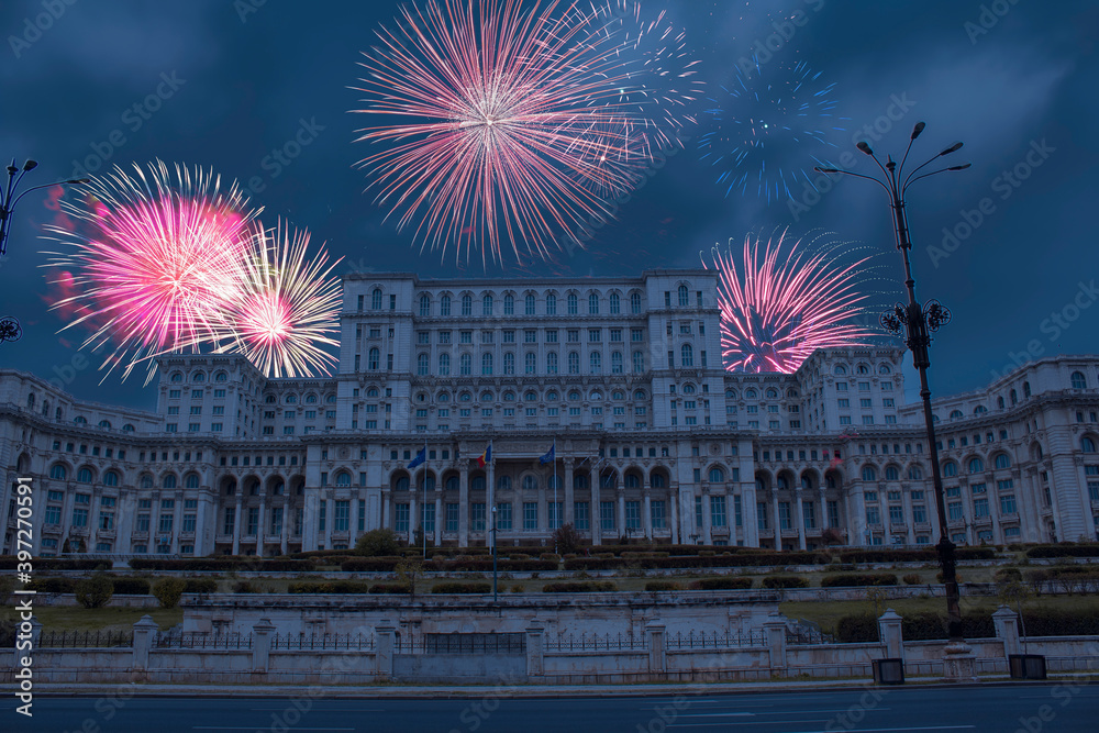 Celebratory fireworks for new year over The Palace of the Parliament, Bucharest, Romania. during last night of year. Christmas atmosphere