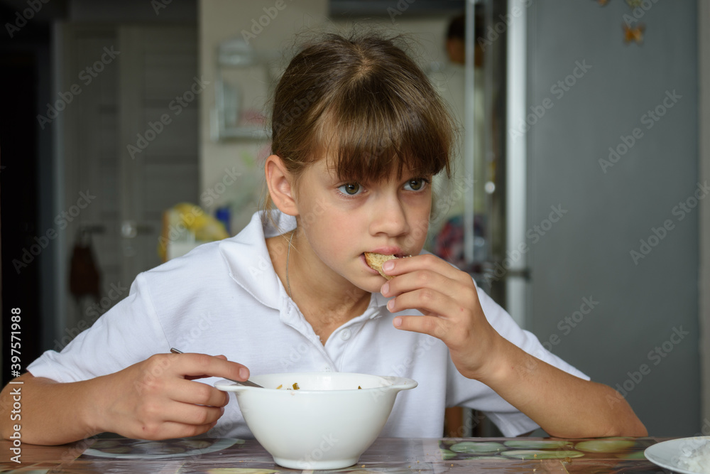 Tired hungry schoolgirl eating soup at the table in the kitchen