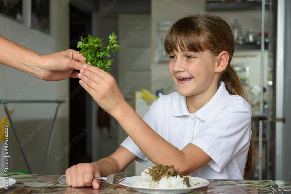 The girl happily takes fresh herbs from her mother's hands at lunch