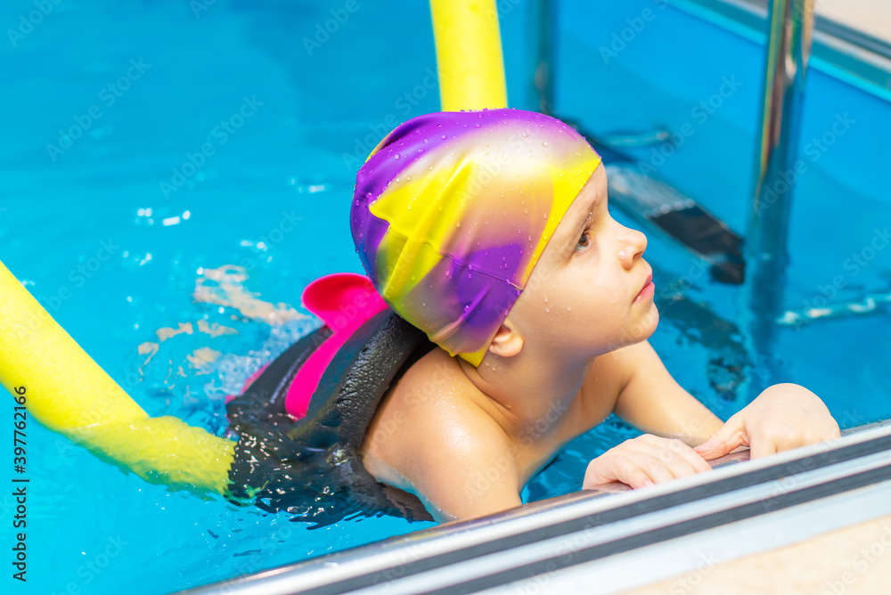 A small child with a life jacket on his chest is learning to swim in an indoor pool.