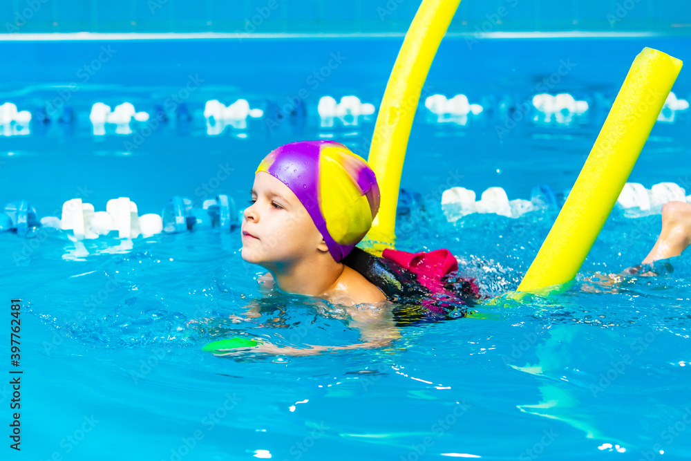 A little boy with a life jacket on his chest learns to swim in an indoor pool.