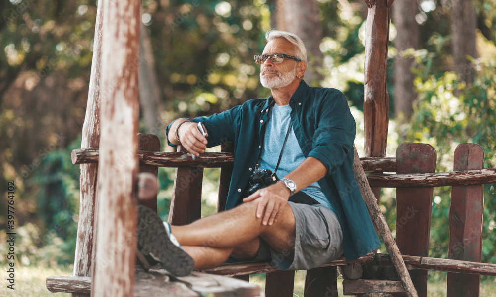 The senior man sits on a bench and holds on to his knee. Rest in the park on a bench, pain in the legs.