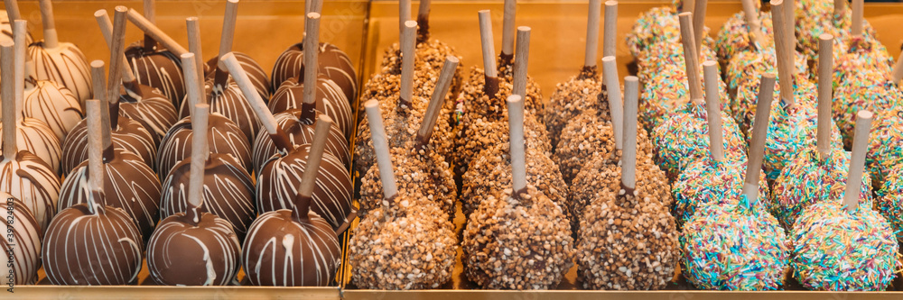 Caramel apples with nuts in glaze and chocolate on a tray at the fair