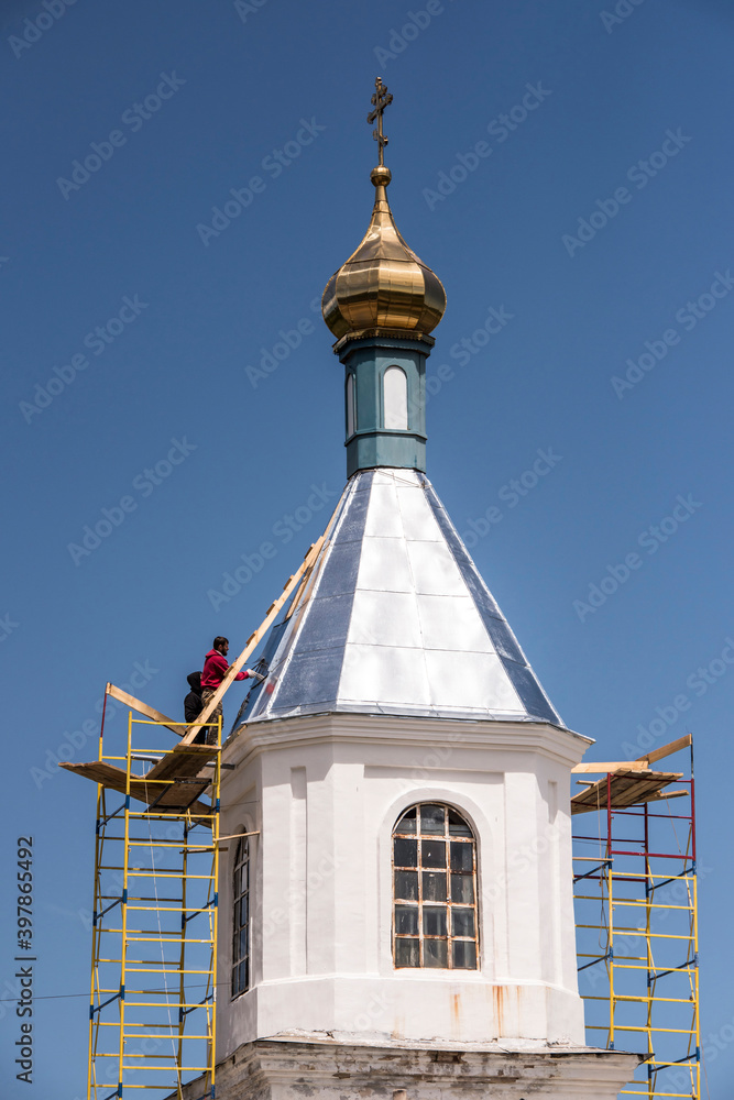 Church of the Nativity of the Blessed Virgin in the village of Konygin (1879). Workers repair the roof