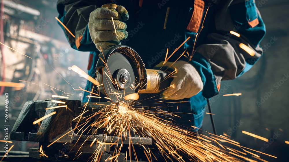 Locksmith in special clothes and goggles works in production. Metal processing with angle grinder. Sparks in metalworking