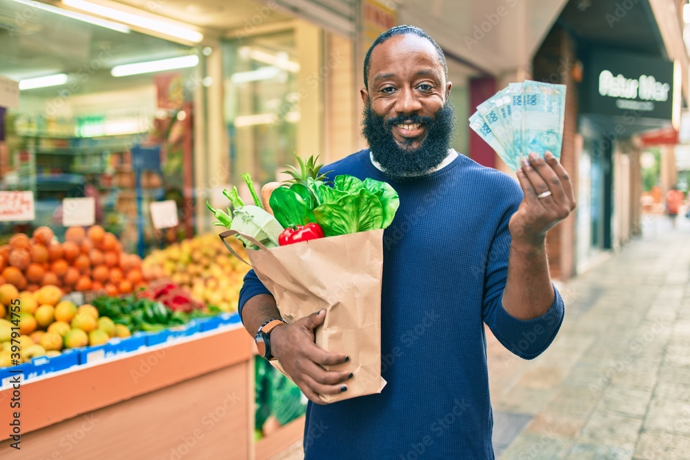 African american man with beard holding paper bag of groceries from supermarket showing 100 brazilian reals banknotes