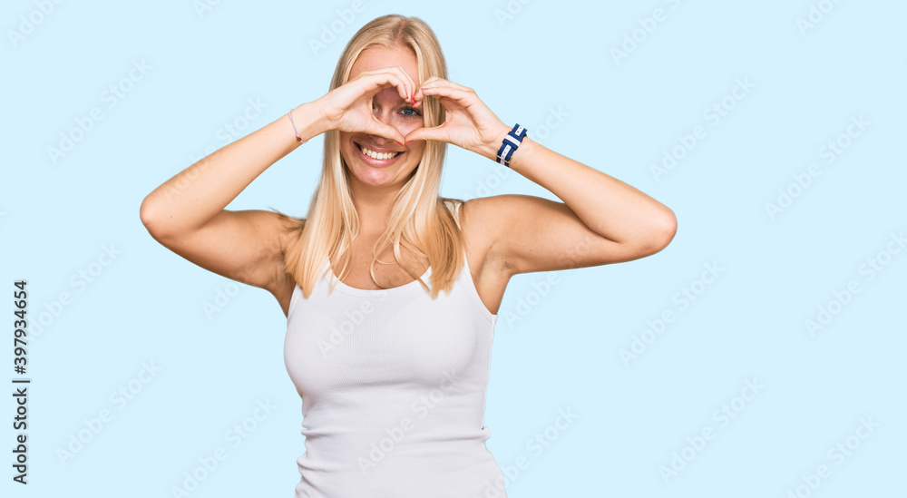 Young blonde girl wearing casual style with sleeveless shirt doing heart shape with hand and fingers smiling looking through sign