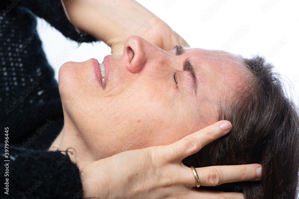 Close up headshot studio portrait stressed mad woman covering ears with hands on white background