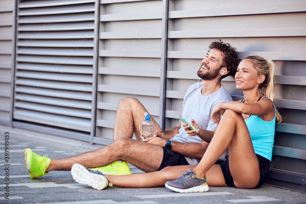 Modern urban couple making pause on the sidewalk during jogging / exercise.