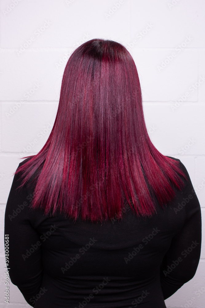 Rear view of the woman with beautiful pink straight long hairs wearing black sweater